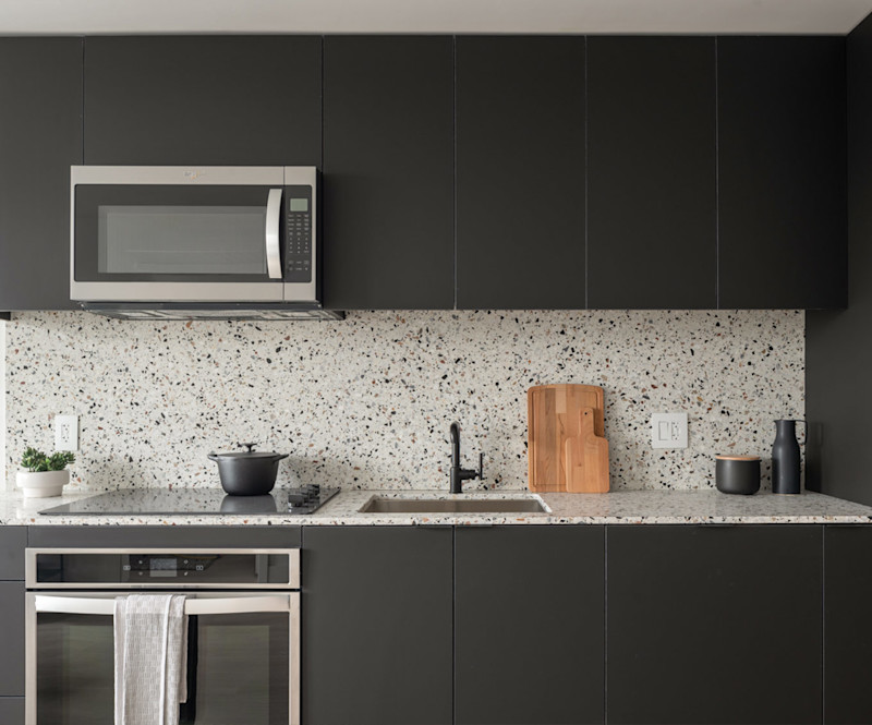 - Quartz countertops with terrazzo finish
