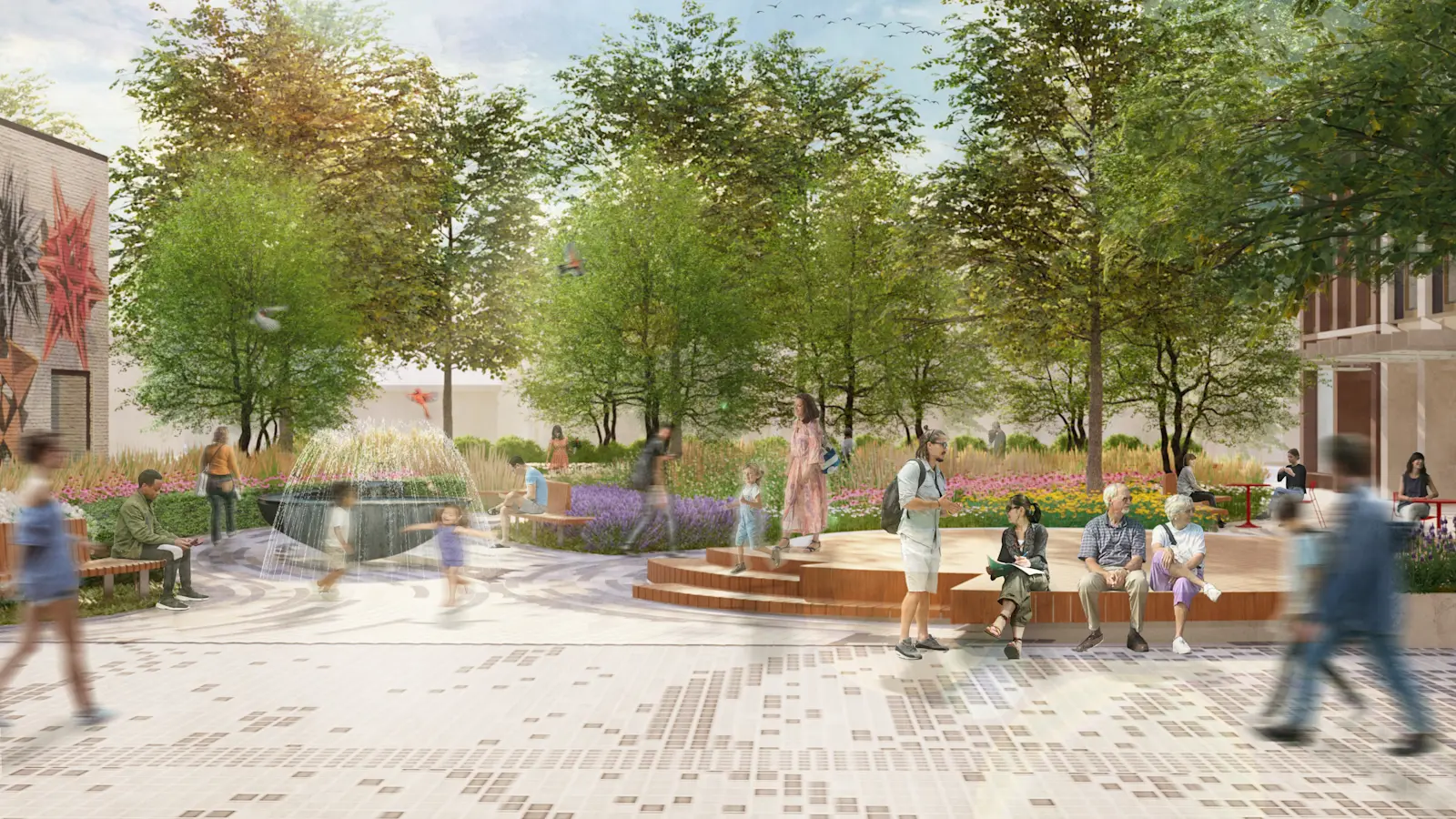An expansive new public park is integrated into Mirvish Village, offering residents and the community a serene, greenery-filled gathering space.